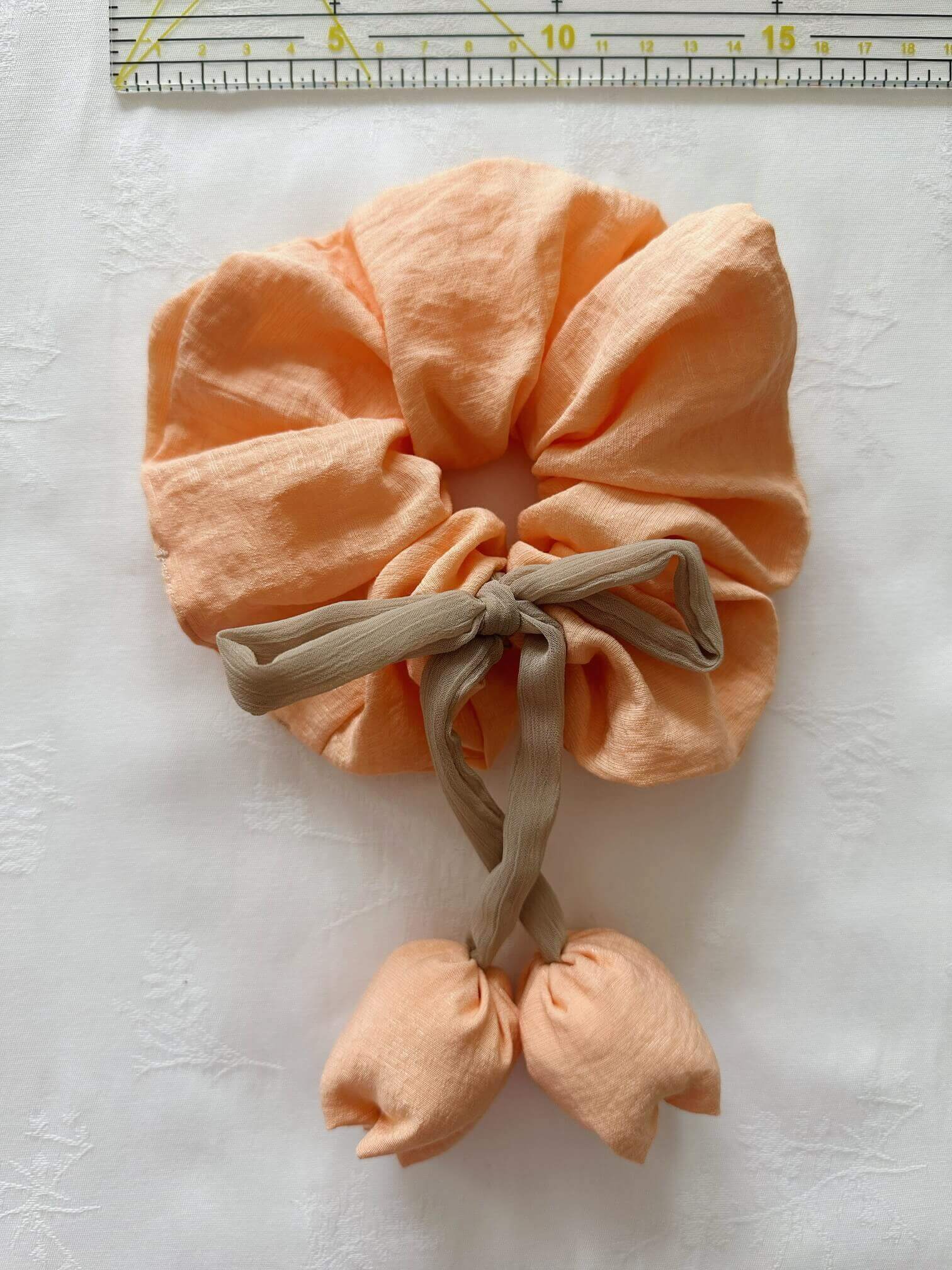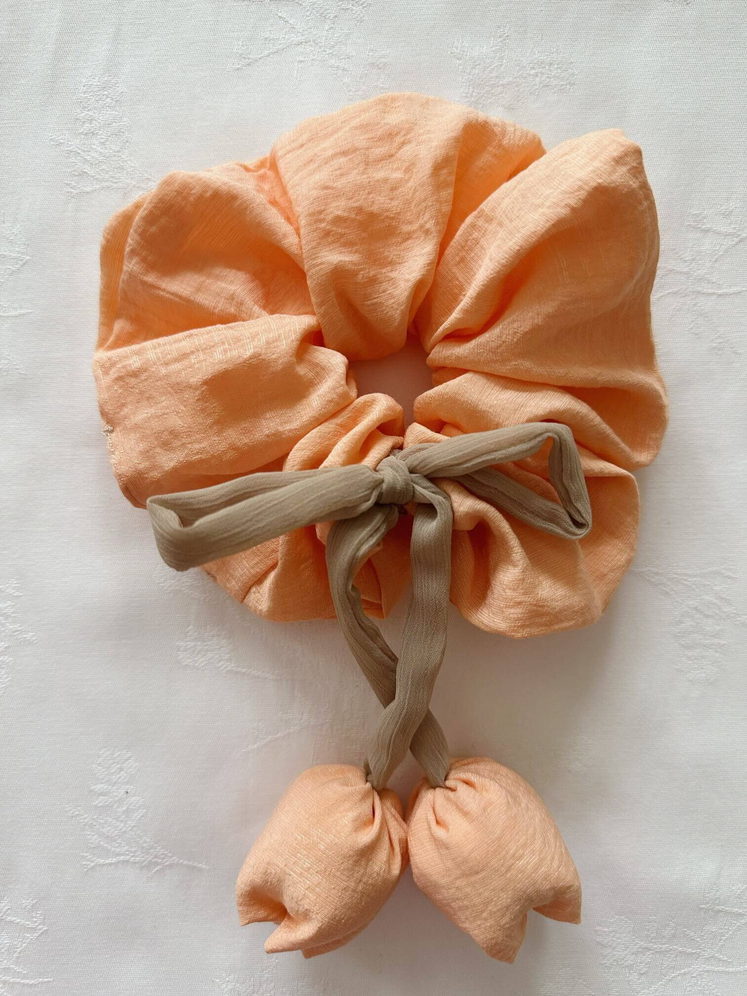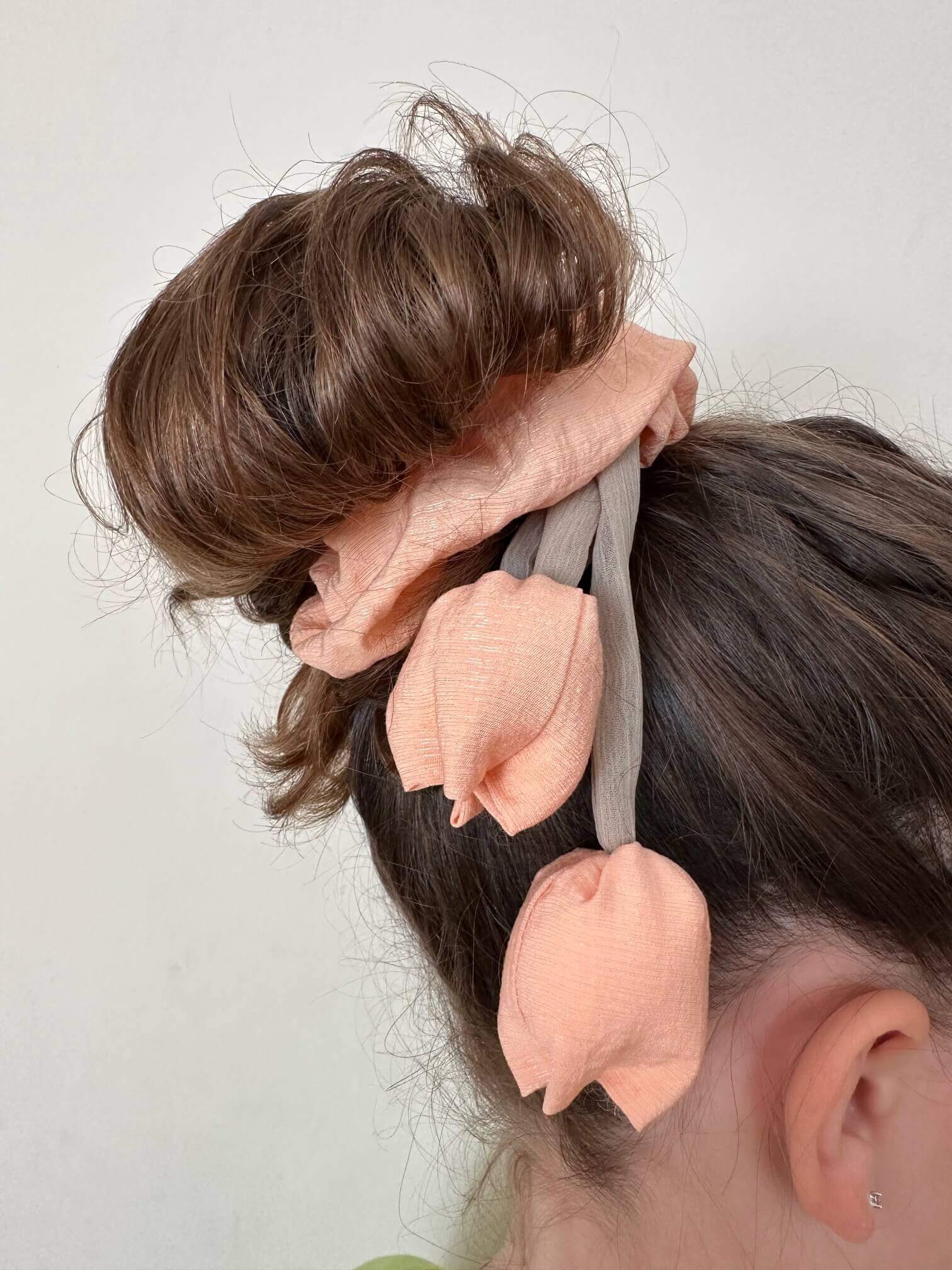 Pastelno-narančasta gumica za kosu s tulipanima koje možete po potrebi odvezati i ponovno svezati na gumicu.